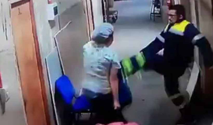 La víctima, también una trabajadora de la clínica, aparece en el video discutiendo con el sujeto en un pasillo del centro de salud. Luego, él la toma del cabello y comienza a amedrentarla para luego empujarla hacia la puerta.
