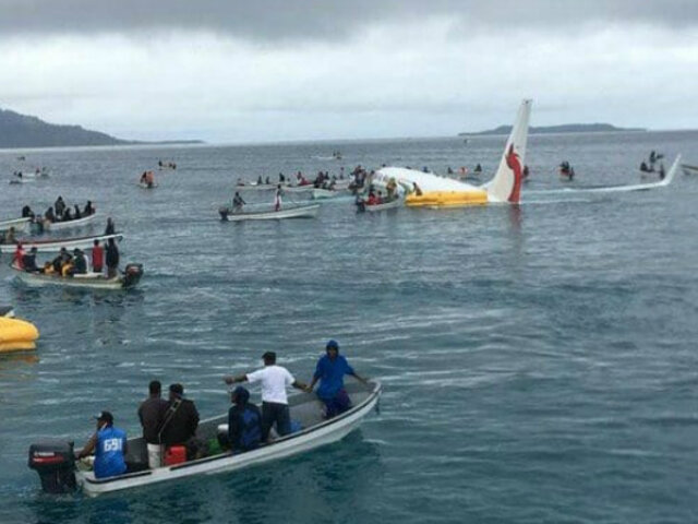 Un avión Boeing 737-800 de la compañía Air Niugini de Papúa Nueva Guinea, acabó en una laguna costera tras saltarse la pista durante el aterrizaje, cerca al Aeropuerto Internacional de Chuuk, en la isla de Weno, en Micronesia.