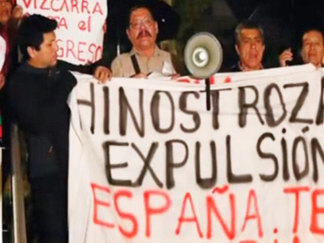 Pese a lo avanzado de la hora, el nutrido grupo de peruanos llegó con pancartas y con arengas solicitaban la expulsión del ex magistrado.