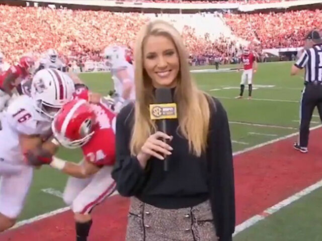La periodista norteamericana Laura Rutledge se disponía a hacer su reporte desde una cancha donde se llevaba a cabo un partido, cuando accidentalmente fue derribada por dos jugadores universitarios de fútbol americano que forcejeaban.