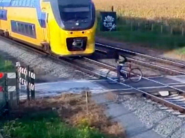 Un hombre que venía manejando una bicicleta casi es arrollado por un tren cuando intentó cruzar las vías en algún lugar de Holanda.