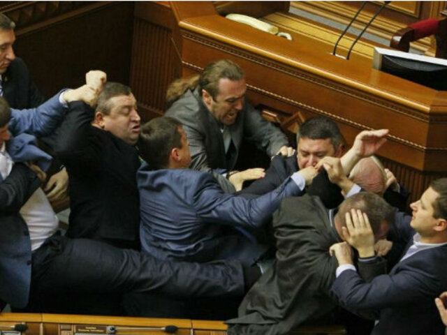 Una desenfrenada pelea se armó en el parlamento ucraniano. Como se muestra en imágenes, a los diputados no les importó agarrarse a golpes en frente de varias cámaras de televisión que captaban cada uno de sus movimientos.