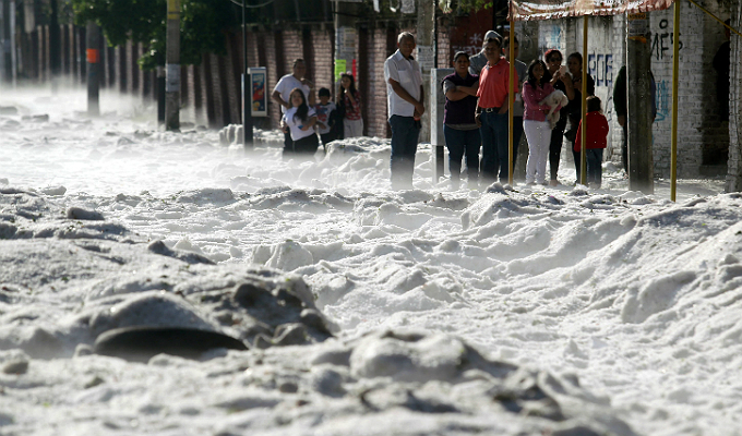 Según autoridades de ese país, el granizo alcanzó hasta un metro de altura en algunas partes, mientras que en al menos seis colonias en el límite con Guadalajara, la capa de hielo llegó hasta dos metros. Maquinaria pesada llegó hasta el lugar para remover el material de las calles.