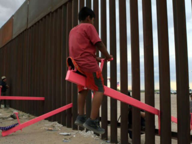 El muro físico que existe entre las fronteras de Estados Unidos y México fue utilizado para implementar tres sube y baja de color rosa de manera temporal.