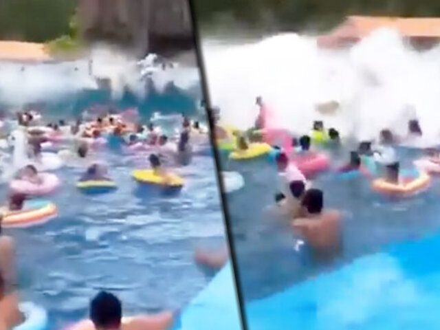 Una grabación hecha por uno de los visitantes del parque muestra como de manera repentina se forma en la piscina una ola gigantesca que se lleva por delante a numerosos bañistas, entre ellos niños.