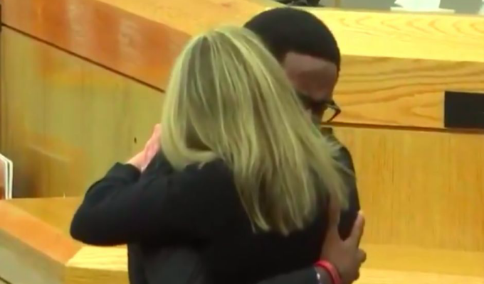 En Estados Unidos, un joven de 18 años abrazó a la expolicía que asesinó a su hermano, después de que la condenaran a 10 años de cárcel. La mujer, que aseguró haber disparado por error, se deshizo en lágrimas en los brazos del familiar de su víctima.