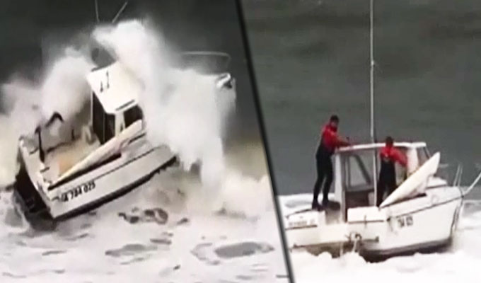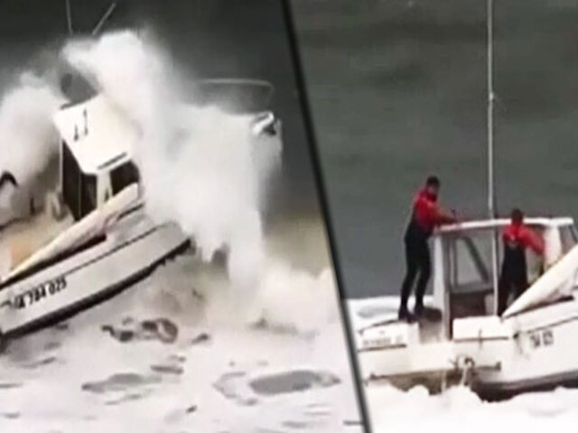 Las dramáticas imágenes muestran una embarcación a flote en aguas extremadamente agitadas. A medida que el barco se mueve más hacia afuera, se acerca una enorme ola que rápidamente lo vuelca.