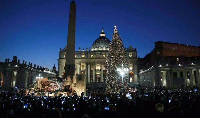 Un imponente árbol navideño lució en la Plaza de San Pedro del Vaticano, con 26 metros de altura, cerca al monumental nacimiento de tamaño real. Este árbol fue decorado con luces de bajo consumo y proviene de los bosques de Véneto, en sustitución se replantarán otros 40.