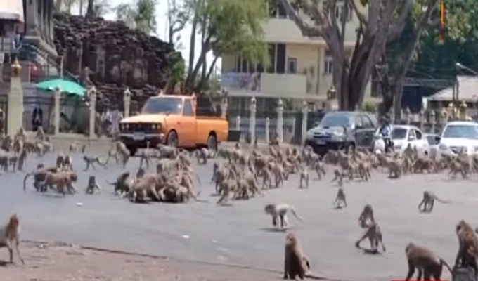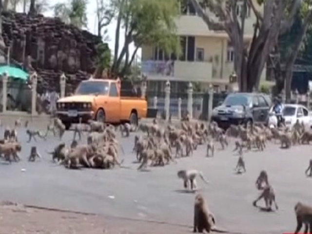 Cientos de monos desesperados por alimentos se enfrentaron en la calle de la localidad de Lopburi. Esta ciudad que alberga aproximadamente 3 mil monos está ubicada a 150 kilómetros hacia el norte de la capital, Bangkok y sufre la escasez de turistas a causa del coronavirus.