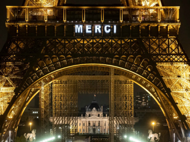 A partir de las 20:00 horas (19:00 GMT), el emblemático monumento mostró un "gracias" durante 30 minutos, dirigido a los profesionales que están en primera línea en el combate contra el Covid-19, señalaron sus organizadores.
