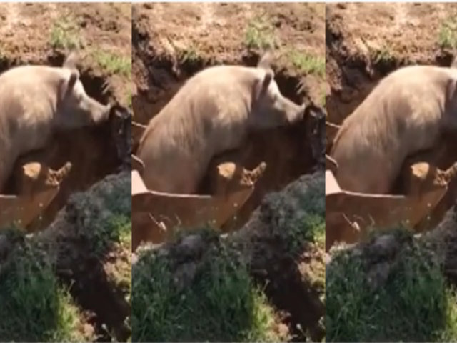 Un grupo de trabajadores de construcción no dudaron en rescatar a un cerdito que cayó a un hueco, pero utilizando una excavadora.