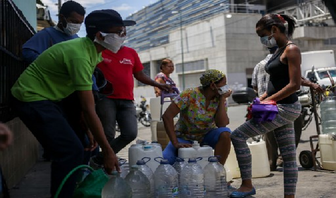 En pleno estado de emergencia, un grupo de venezolanos aprovecha el agua acumulada en una obra paralizada para poder abastecerse del líquido vital, frente a la brutal escasez a la que se enfrentan por falta de agua potable a nivel nacional.