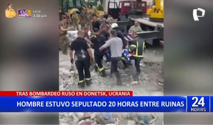 Personal de rescate, el cuerpo de Bomberos y voluntarios de la zona, lograron rescatar a un ciudadano ucraniano, quien estuvo 20 horas sepultado entre escombros, luego que la armada rusa ejecutara un bombardeo a edificios residenciales en Donetsk, Ucrania.