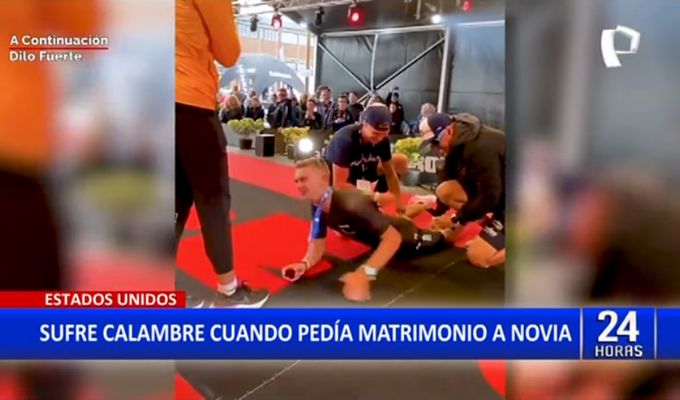 El deportista en mención había terminado de participar en una competencia de Ironman, cuando procedió a inclinarse para pedirle la mano a su pareja, no obstante, la actividad que realizó previamente le jugó una mala pasada y terminó acalambrado en ambas piernas.