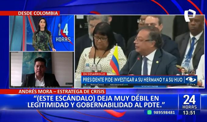 En entrevista para 24 Horas Mediodía, indicó que este anuncio de la Fiscalía colombiana hace tambalear al gobierno de Petro, a quien ya le vienen exigiendo su renuncia desde el Congreso de dicho país.