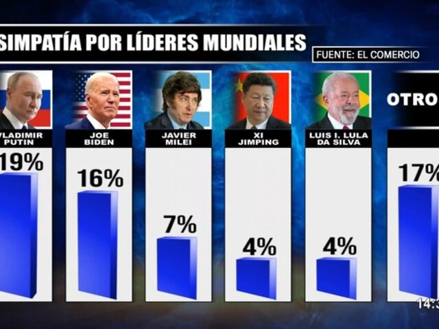 Le siguen el estadounidense Joe Biden (16%) y el chino Xi Jinping (4%). Sorprendentemente, un 22% de los peruanos indicó no sentir simpatía por ninguno de estos líderes internacionales.