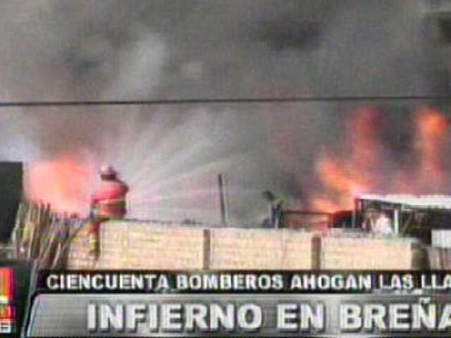 Un incendio de regulares proporciones causó alarma en Breña. Cincuenta bomberos fueron necesarios para sofocar el fuego que afectó a diez viviendas.