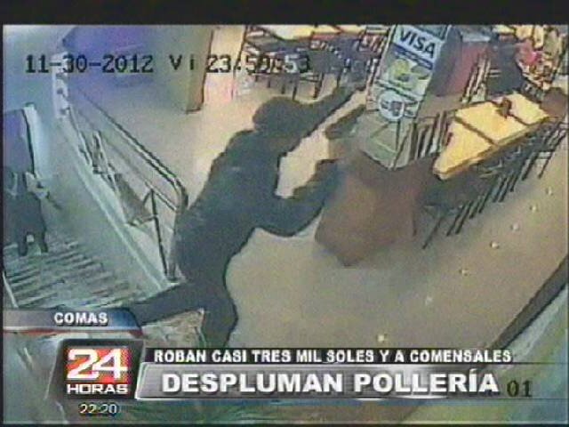 Cámaras de seguridad captaron un violento asalto a una pollería en Comas. Desvalijaron a los comensales y trabajadores.