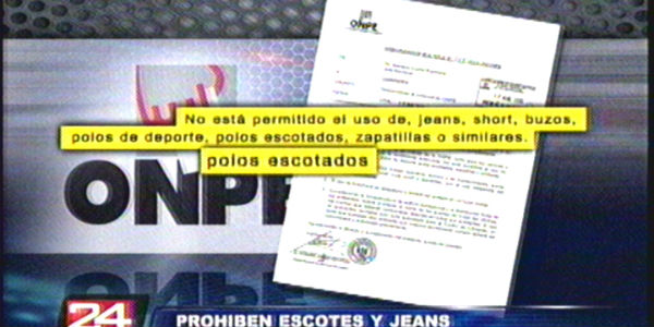 “La asistencia a las oficinas de trabajo de la ONPE, tanto para los varones y mujeres, se hará con la vestimenta adecuada. No está permitido el uso de jeans, shorts, buzos, polos de deporte, polos escotados, zapatillas o similares”, señala el documento difundido por “Vela verde”.
