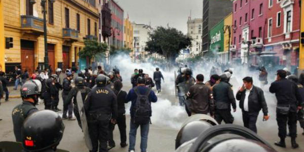 Hasta el momento 15 detenidos deja la manifestación convocada por diversos sectores sociales en la capital. La trifulca se inició cuando un grupo de manifestantes intentó cruzar el cordón policial a la altura de la Avenida Abancay y el Jirón Puno por lo que la Policía arremetió con bombas lacrimógenas. En la Avenida Abancay, jóvenes que participaban de la marcha ‘Toma la calle’, denunciaron que fueron perseguidos y golpeados por agentes policiales que impedían a la manifestación llegar hasta el Congreso de la República. Integrantes de los colectivos congregados, transeúntes y los mismos policías resultaron afectados por los gases. Entre las personas intervenidas hay algunos militantes apristas, trabajadores de la CGTP y barristas del club Universitario de Deportes, a quienes la Policía señala como los responsables del inicio del caos, debido a que intentaron quebrar el cordón policial.
