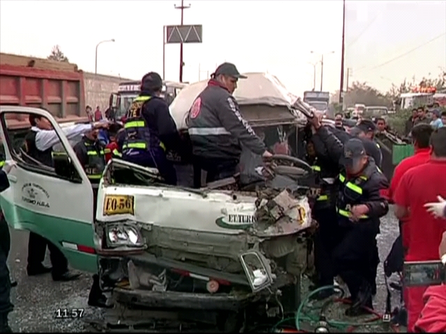 El aparatoso accidente ocurrió en el kilómetro 5 de la Carretera Central, donde 10 personas resultaron heridas, 4 de ellos de consideración tras quedar atrapados entre los fierros.