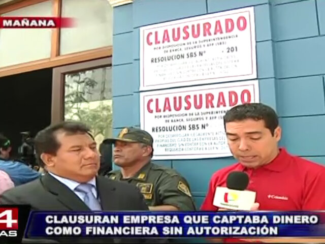 La Superintendencia de Banca, Seguros y AFP clausuró el local de la mencionada compañía por no contar con la autorización para captar dinero del público.