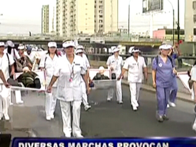 Gran congestión vehicular se produjo en el Centro de Lima debido a la multitudinaria marcha de una congregación cristiana en contra del matrimonio entre personas del mismo sexo. A esto se sumaron las enfermeras de Hospital Militar también salieron a las calles.