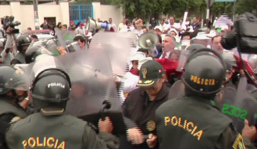 Un grupo de médicos y miembros de la Policía Nacional se enfrentaron en el frontis del Hospital Edgardo Rebagliati, Jesús María. Los efectivos policiales utilizaron bombas lacrimógenas.