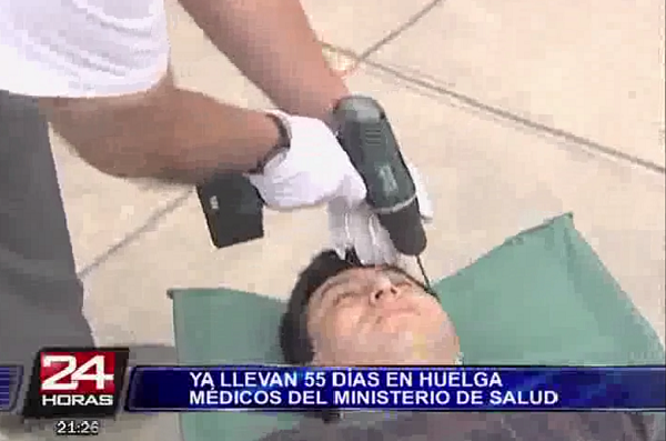 Los médicos del Ministerio de Salud (Minsa) quienes llevan 55 días de paralización, realizaron una nueva protesta en el frontis del ministerio y recrearon una intervención quirúrgica en la vía pública