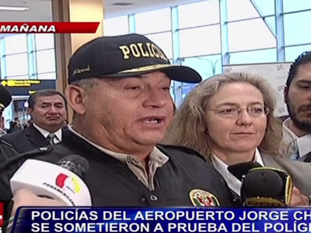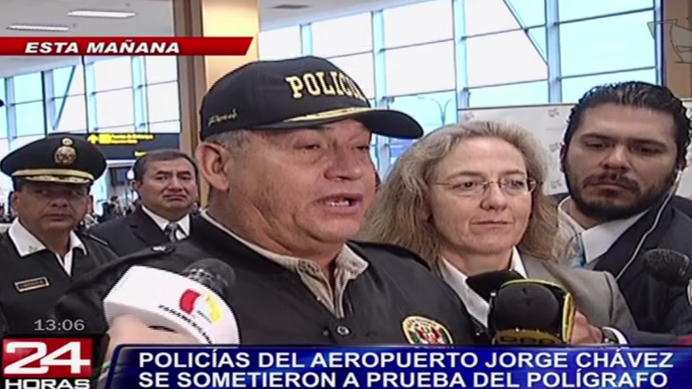 El ministro del Interior, Daniel Urresti, presentó a los policías, que trabajan en el aeropuerto Jorge Chávez, que pasaron satisfactoriamente la prueba del polígrafo. Urresti Elera manifestó que es la primera vez que se realiza un procedimiento de este tipo y anunció que esta prueba se repetirá cada tres meses.