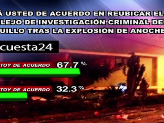 En Encuesta 24, a la pregunta de este martes: “¿Está usted de acuerdo el complejo de investigación criminal de Surquillo tras la explosión de anoche?”, un 67.7% se mostró a favor de la medida.