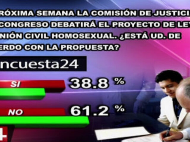 En Encuesta 24, la mayoría de participantes se mostró en desacuerdo con el proyecto de la Unión Civil entre personas del mismo sexo, cuyo debate se realizará la próxima semana.