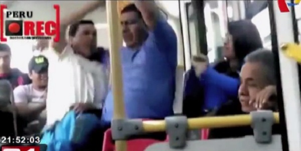 Un curioso video registrado al interior del Metropolitano, viene causando diversas reacciones entre los usuarios de las redes sociales. En él se ve a dos sujetos protagonizando una acalorada discusión por un asiento del bus. En esta vergonzosa escena se aprecia que ambos hombres no dejan de discutir, a pesar que uno de ellos ya se encontraba sentado. También se aprecia que una mujer, que ocupaba un sitio vecino discute con ambos sujetos que peleaban a su costado, al sujeto de polo azul lo empuja para que no siga estorbándola pero no logra que éste se retire. Finalmente el hombre logra desalojar al otro individuo a empujones.