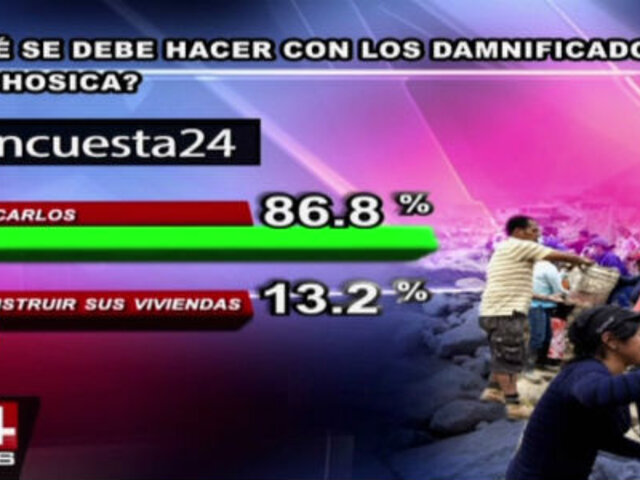 A la pregunta de este miércoles en Encuesta 24: “¿Qué se debe hacer con los damnificados de Chosica?rdquo;, un gran 86.8% de participantes opinó que se debe reubicarlos. El 13.2% restante votó por reconstruir sus viviendas.