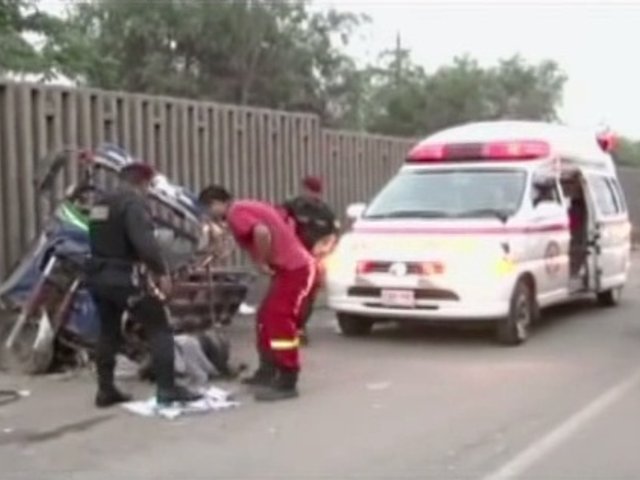 El choque producido entre dos camiones de carga menor dejó cuatro personas heridas en la carretera Ramiro Prialé, a la altura de El Agustino. Testigos afirman que uno de los conductores salió por la ventana del vehículo para auxiliar a las víctimas.