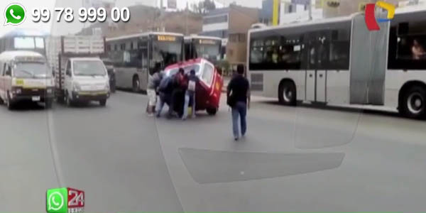 Nuestros televidentes nos envían estas imágenes registradas en la avenida Tupac Amaru en San Martín de Porres. El accidente derribó el vehículo menor en cuyo interior viajaban dos personas, que afortunadamente no sufrieron heridas de gravedad.