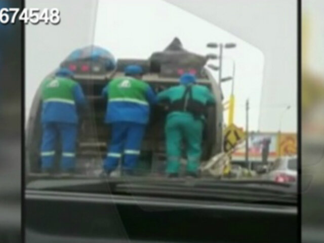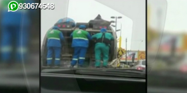 Un televidente de 24 Horas captó a trabajadores de limpieza pública de la Municipalidad de Surquillo viajando colgados de un camión recolector en el cruce de la avenida Angamos con Paseo de la República. Tal como se aprecia en las imágenes, los tres obreros se desplazan de manera temeraria, exponiéndose a sufrir un accidente.