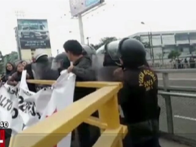 Jóvenes universitarios del grupo aprista Renovar se enfrentaron a la policía en el puente Aramburú. Los manifestantes intentaron colocar carteles por el Día de la No Violencia contra la Mujer pero fueron retirados por efectivos de la Policía Nacional.