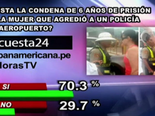 Los resultados de Encuesta 24 a la pregunta de este lunes revelaron que el 70.3% de peruanos cree que es justa la condena de seis años de prisión para Silvana Buscaglia, la mujer que agredió a un policía en el aeropuerto Jorge Chávez. Sin embargo, un minoritario 29.7% considera que la pena es desproporcionada.