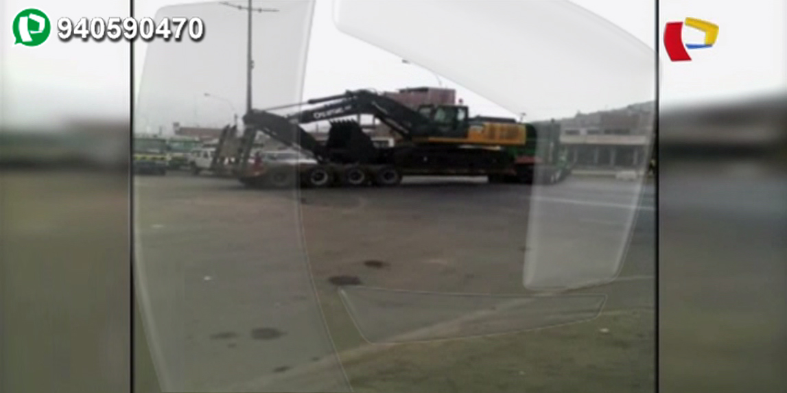 Un video enviado, Miren ustedes como este enorme camión con una retroexcavadora encima cruza la Panamericana Norte provocando tremendo caos y congestión vehicular.