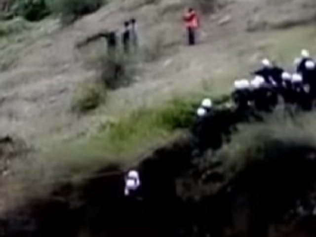 En las imágenes se puede apreciar el preciso instante en que los agentes hacen su ingreso a través de un deteriorado puente que a duras permanece en pie. Se puede apreciar como el huaico empieza a llevarse a los camiones.