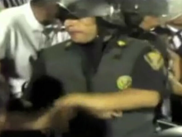 En medio del caos, un agente propina un escupitajo en el rostro de una mujer con la camiseta de Alianza Lima, que se encontraba en la tribuna sur del estadio. La indignada joven le reclamó a otro policía por el accionar de su colega.