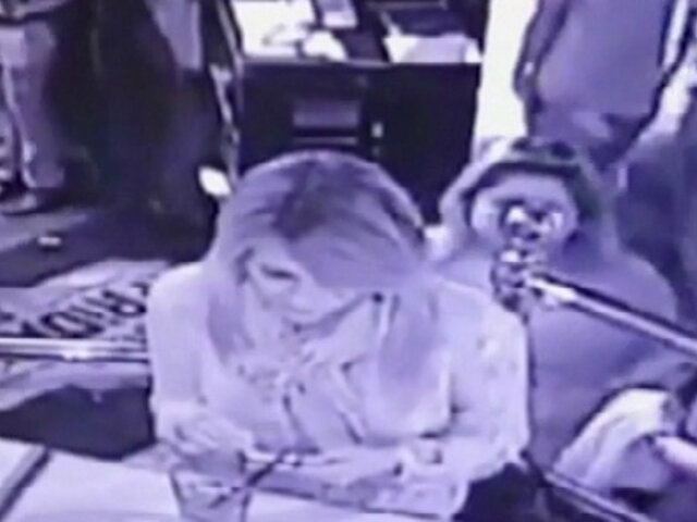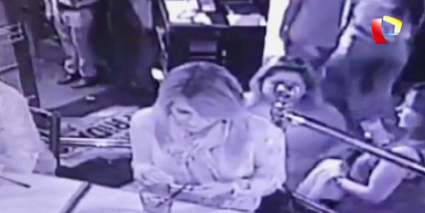 Las cámaras de seguridad de un restaurante ubicado en el óvalo Gutiérrez de Miraflores, captaron el preciso momento en el que la hija del expresidente Alan García sufre el robo de su cartera.