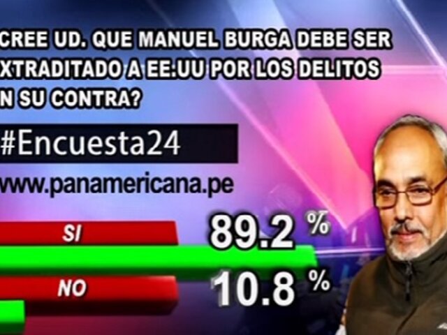 Los resultados de Encuesta 24 a la pregunta de este miércoles revelaron que el 89.2% de peruanos considera que Manuel Burga debe ser extraditado a Estados Unidos por los delitos en su contra. Sin embargo, un minoritario 10.8% considera lo contrario.