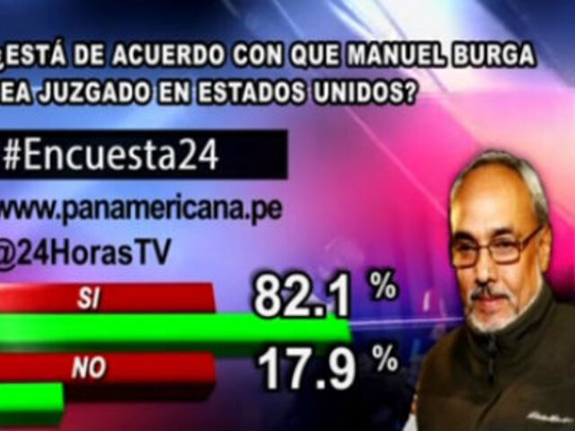 A la pregunta de este jueves en Encuesta 24: “¿Está de acuerdo en que el expresidente de la Federación Peruana de Fútbol, Manuel Burga, sea juzgado en Estados Unidos?rdquo;, un mayoritario 82.1% se mostró de acuerdo con esta decisión, mientras que un 17.9% se mostró en contra.