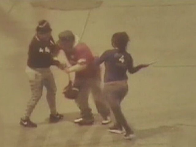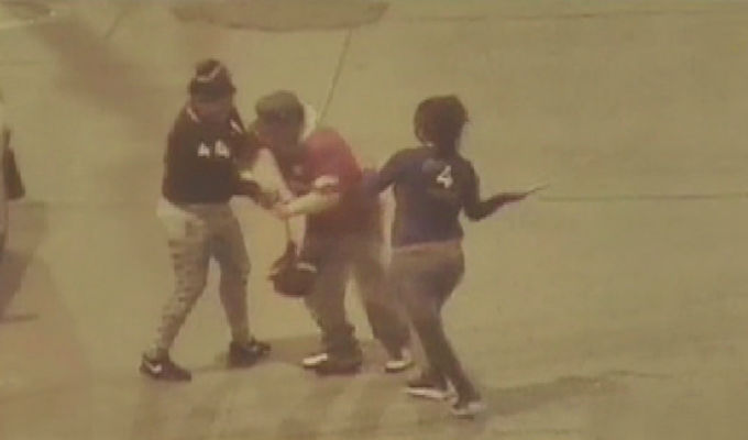 En las imágenes se observa como la tía revisa los bolsillos, mientras la sobrina da bofetadas a la víctima que evita ser asaltado. Una de ellas le arrebata la mochila y lo golpea con ésta, mientras la otra mujer se acerca sosteniendo un palo con el que también lo azota.