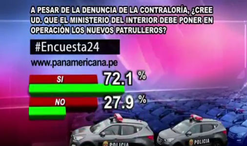 A la pregunta de este martes en Encuesta 24: A pesar de la denuncia de la Contraloría, ¿Cree usted que el Ministerio del Interior debe poner en operación los nuevos patrulleros? un mayoritario 72.1% respondió ‘SÍ’, mientras que un 27.9% contestó ‘NO’.