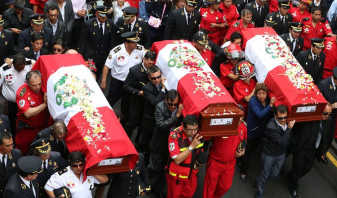 Después de la misa de cuerpo presente realizada en la Catedral de Lima, los féretros envueltos en la Bandera Peruana fueron llevados a la Municipalidad de Lima para recibir homenaje.