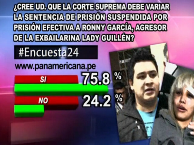 A la pregunta de este martes en Encuesta 24: ¿Cree usted que la Corte Suprema debe variar la sentencia de prisión suspendida por prisión efectiva a Ronny García, agresor de la exbailarina Lady Guillén?, un 75.8% respondió ‘SÍ’, mientras que un 24.2% contestó ‘NO’.