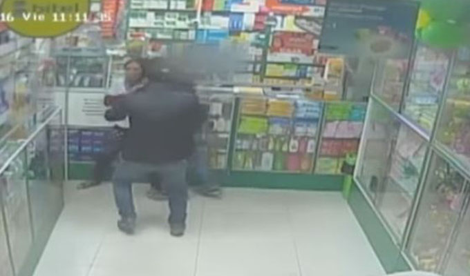 En las imágenes registradas se puede observar que uno de los delincuentes finge tener un dolor estomacal y esperar que la mujer encargada ingrese al local para pedirle a su menor hija que le alcance algún medicamento para esta persona. Aprovechando este momento, el resto de los integrantes ingresa y amenazan con armas en mano a la pequeña.